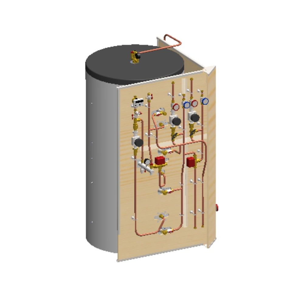 Un ballon tampon/accumulateur de 800 L ou 1000 L avec régulation intégrée : vous connectez vos capteurs solaires thermiques et votre poêle bouilleur, et vous alimentez l’ECS et votre réseau de chauffage. (plancher, murs chauffants, radiateurs).